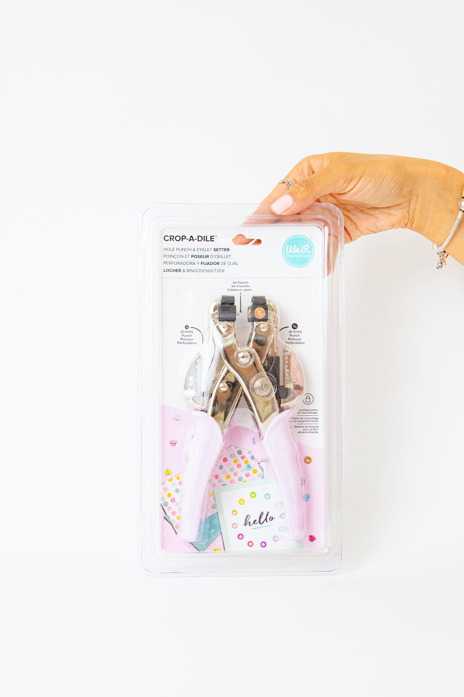 Perforadora y colocador de ojales Crop-A-Dile con asas de color lila. Sin chasquidos, golpes, golpes, torsiones o gruñidos. Esta herramienta todo en uno perfora y ajusta ojales, broches y mucho más.