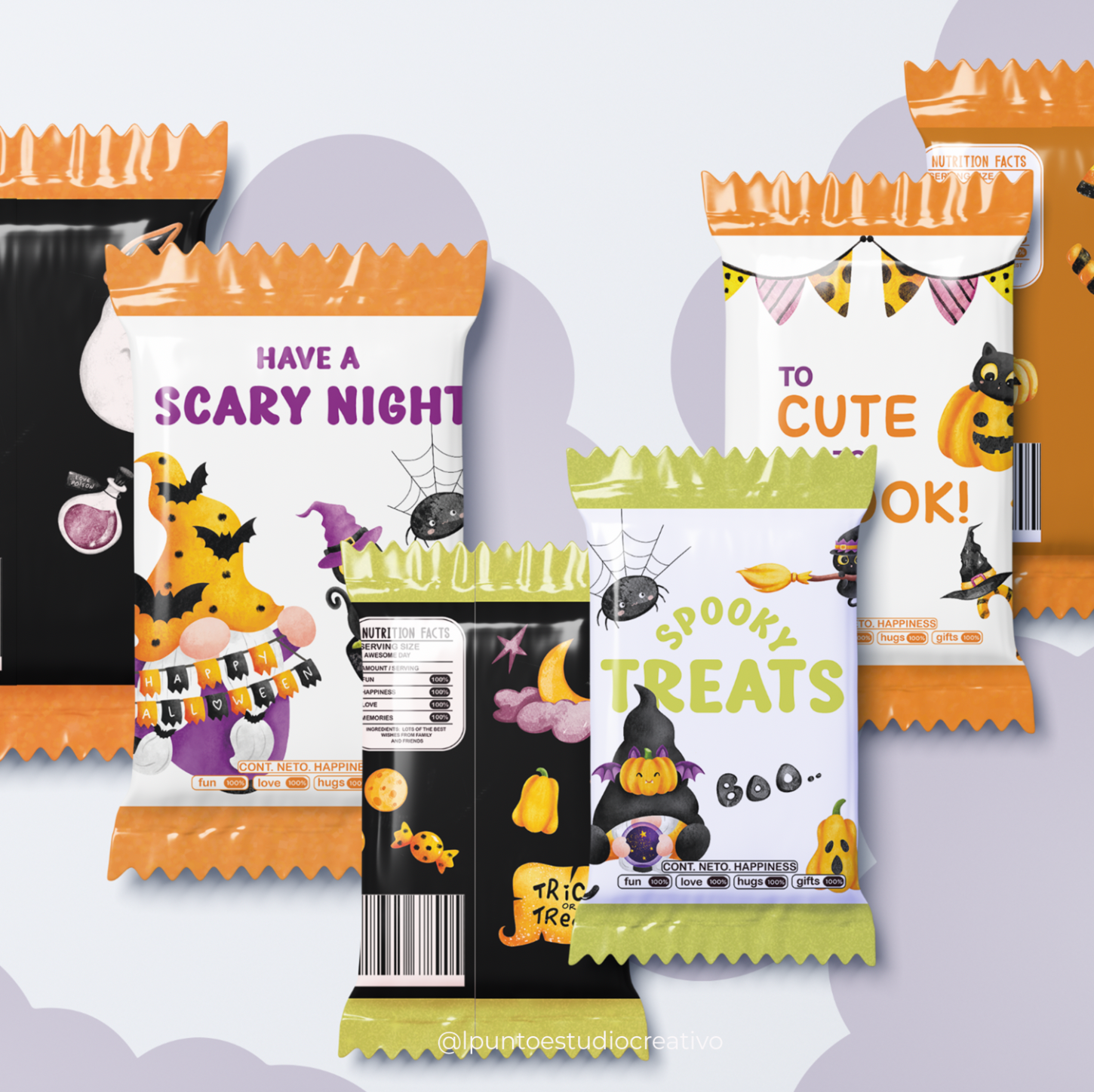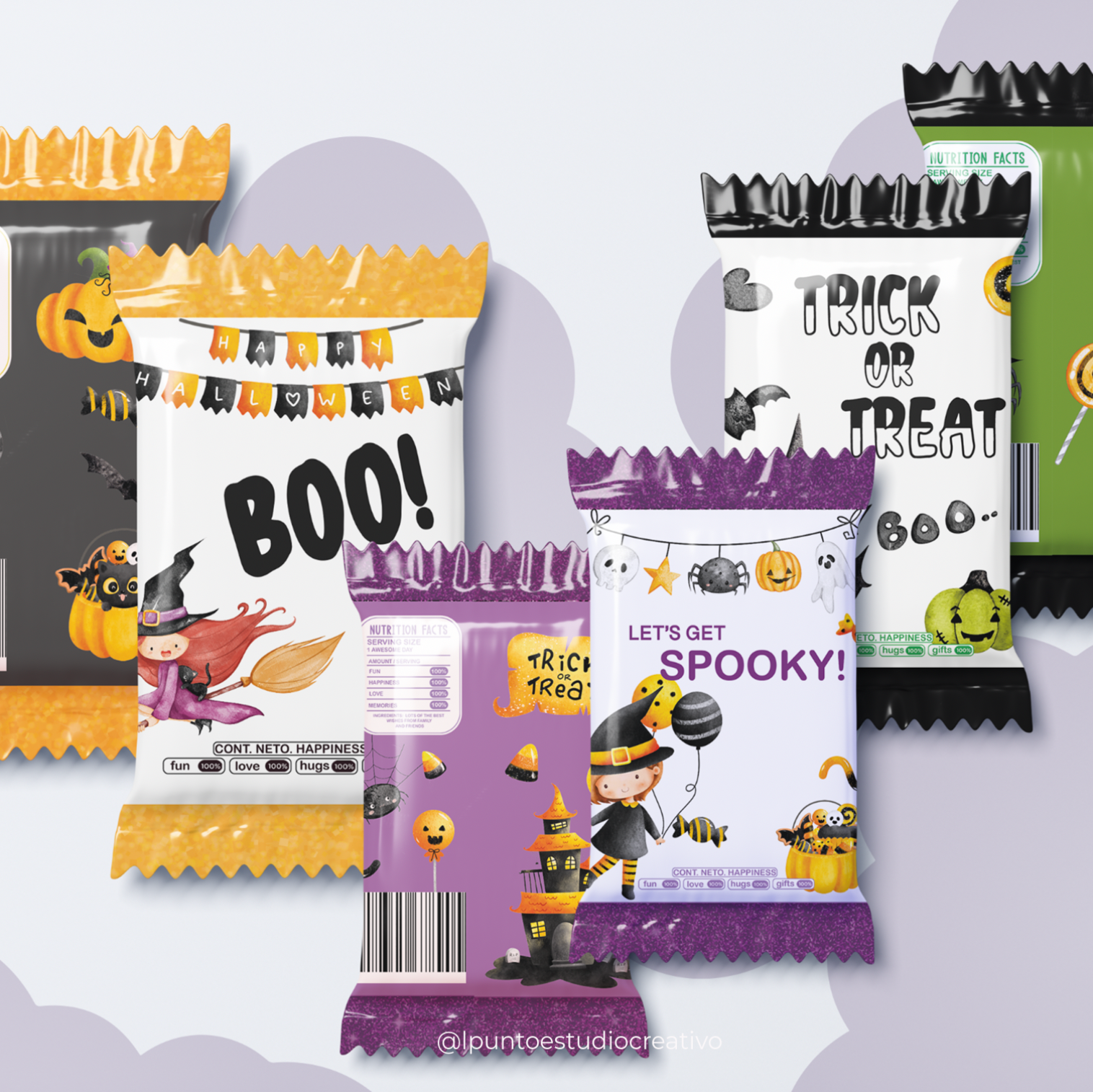 6 diseños diferentes de Candy Bag grande (6 candy bags jumbo para impresión a color, 6 candy bags jumbo con espacio para personalizar y aplicar foil).